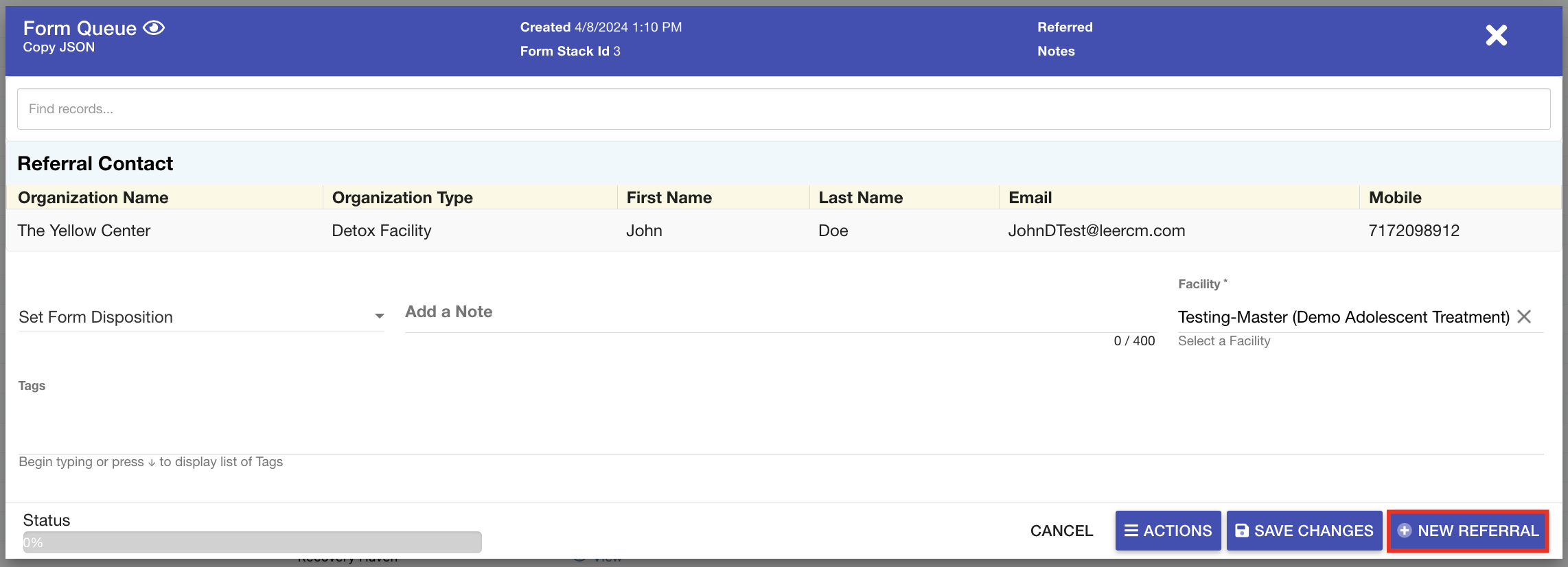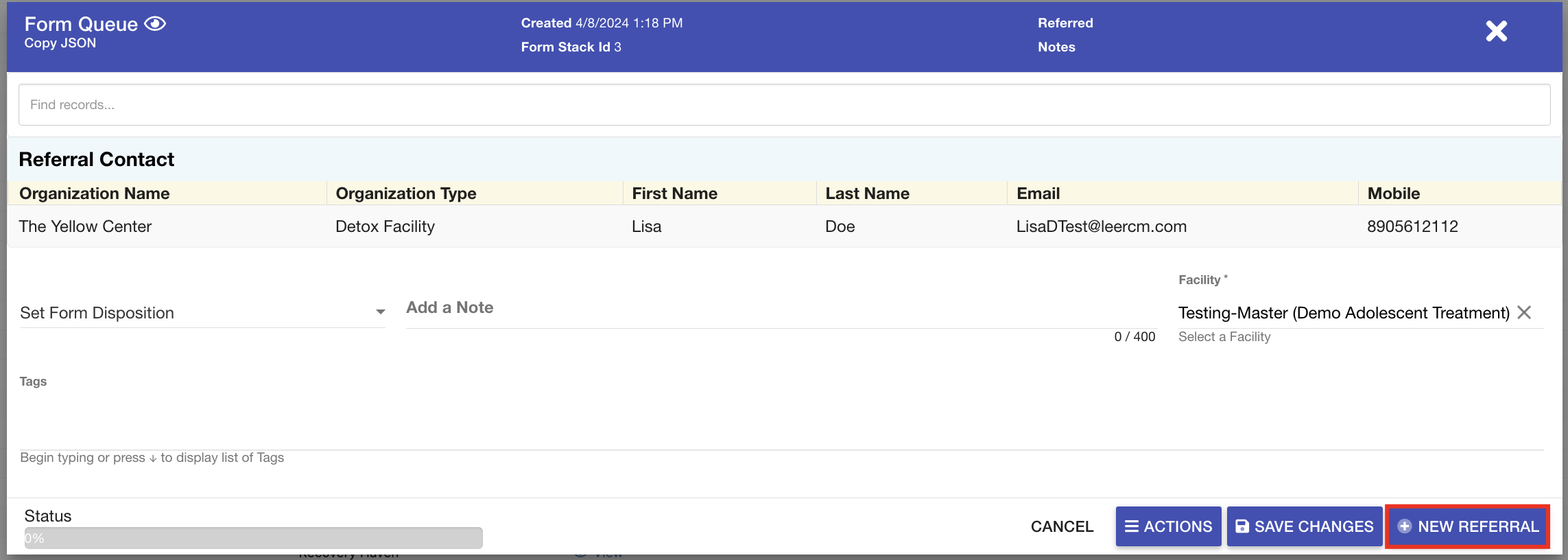 - The form queue record will automatically be dispositioned as Referral Added. The user will be taken to a new tab showcasing the referral source record that was generated using the mapped data points.