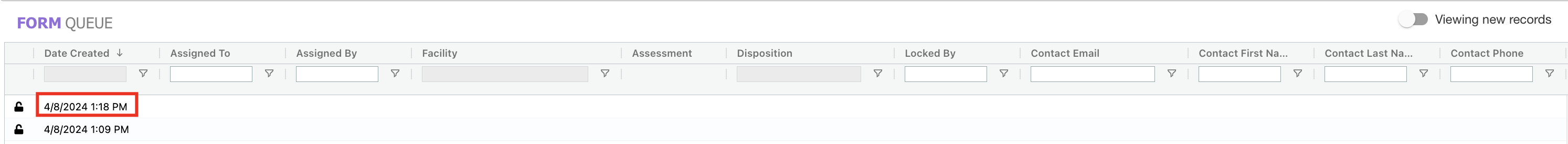 - Locate your desired Form Queue record. Select the Date Created column to access the form submission.