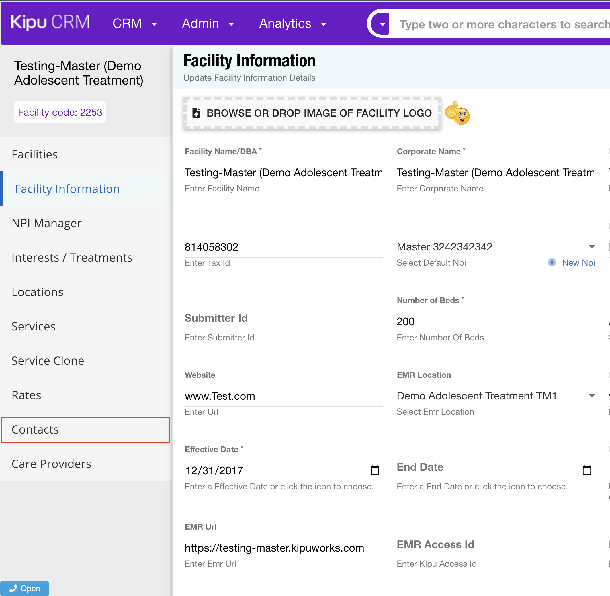 - To disable facility contacts, navigate to CRM > Facilities: