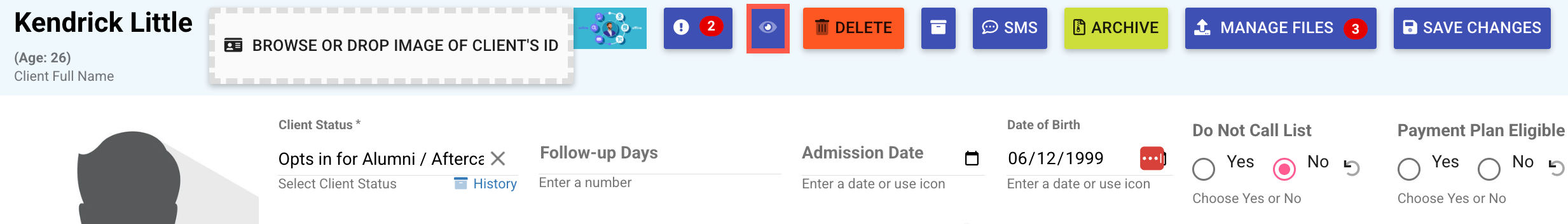 From the Visibility Controller modal, use the required, visible, and/or validation toggles to customize this area in the Kipu CRM.