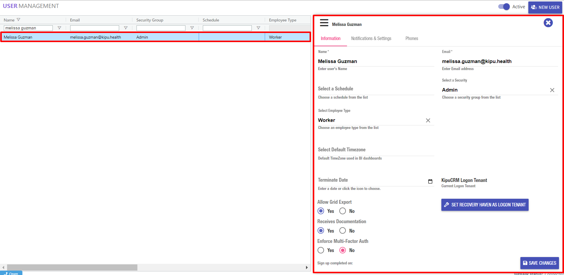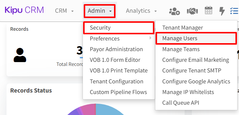 - A Super User within your organization can navigate to the user management section by selecting Admin > Security > Manage Users.