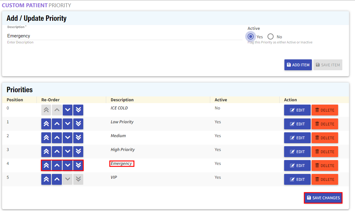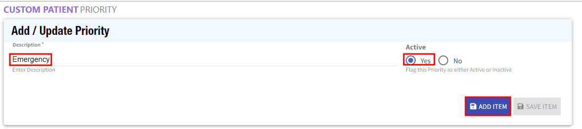 - Enter the priority name into the Description field, set the Active toggle to Yes, and select Add Item.