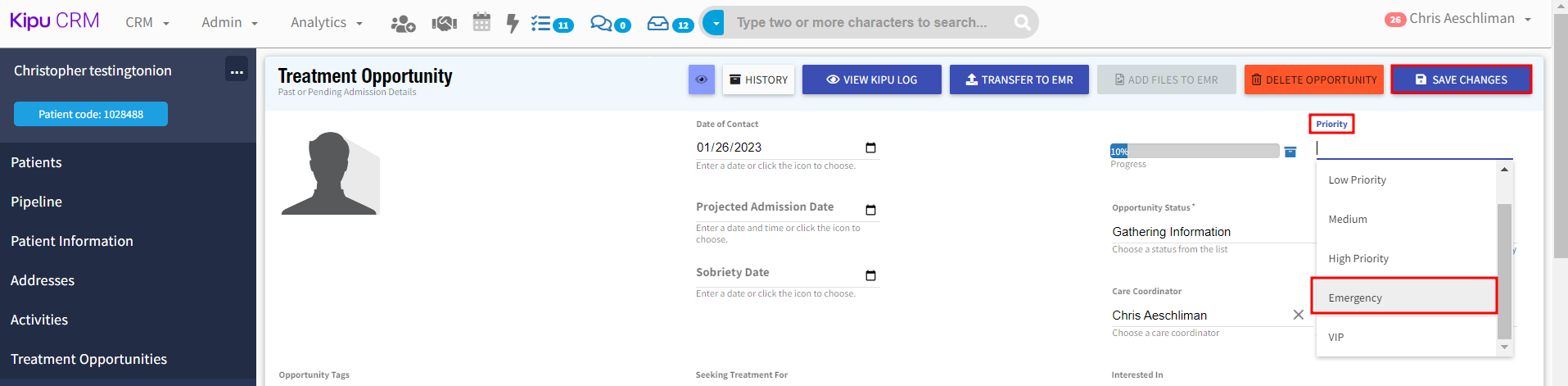 - Next, open any Treatment Opportunity, click the Priority field, select the Custom Priority of your choosing, and click Save Changes.