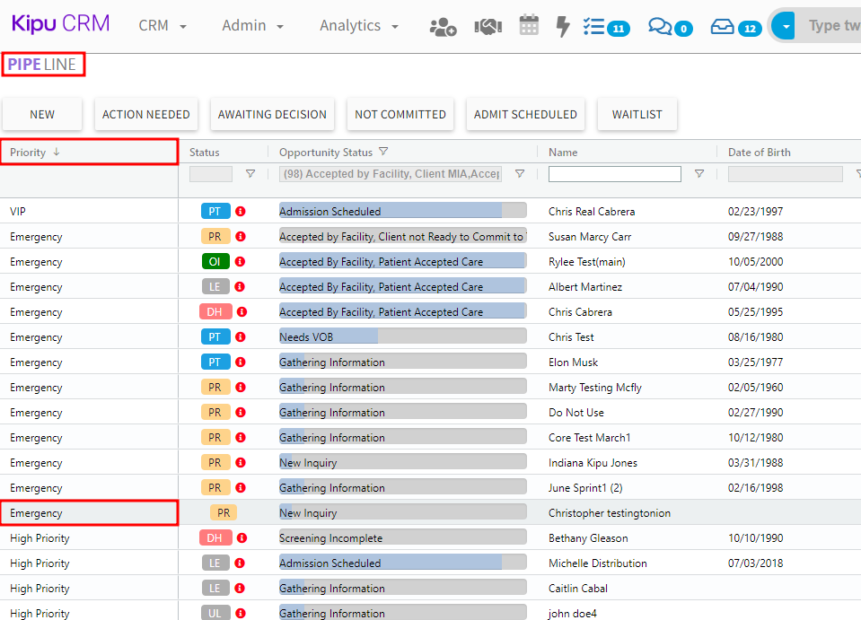 - Return to the Pipeline. The Patient Priority will now be visible.