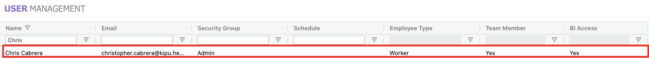 - Locate and select the desired user from the User Management grid.