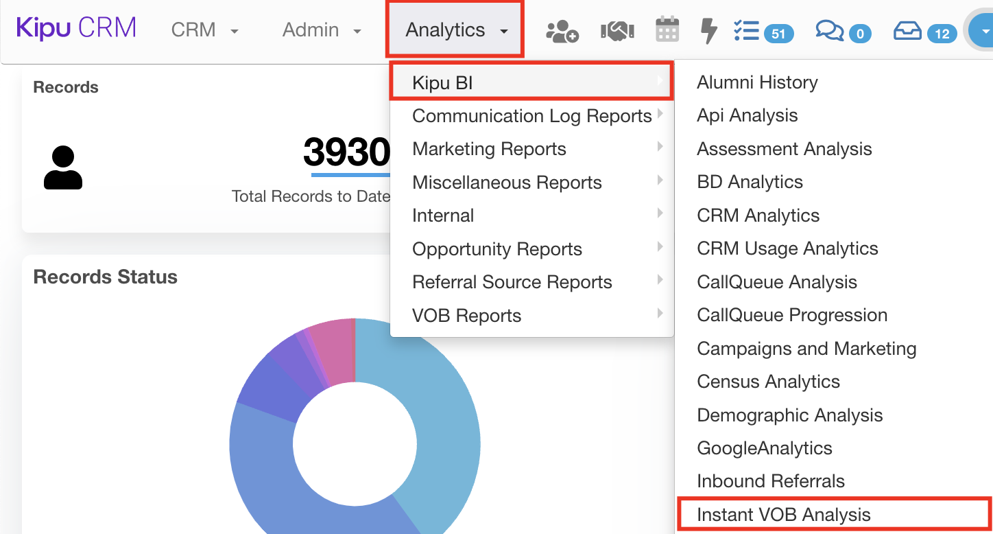 - Navigate to Analytics > Kipu BI > Instant VOB Analysis.
