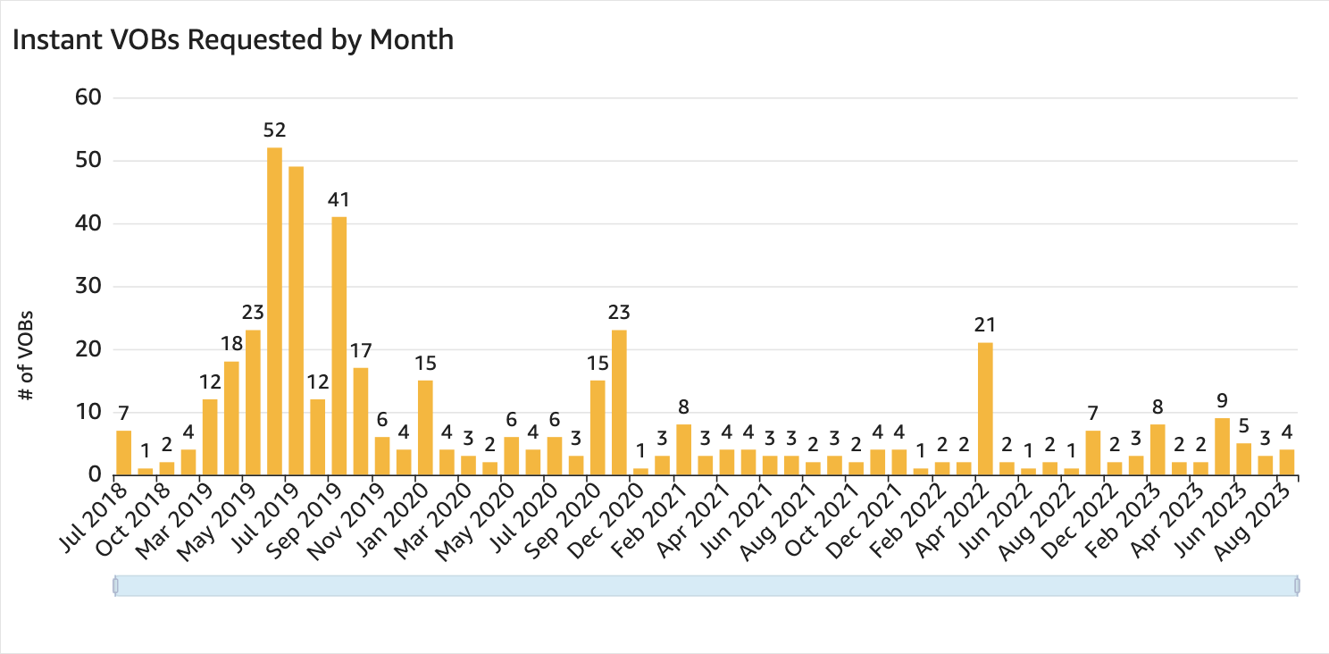 Instant VOBs Requested by Month: Visualization of the total number of instant VOBs requested month over month.