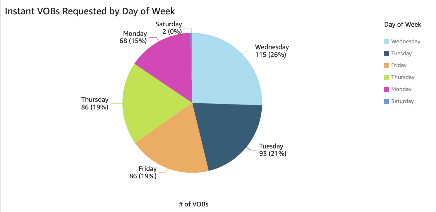 Instant VOBs Requested by Day of Week: Visualization of the total number of instant VOBs requested by day of the week.