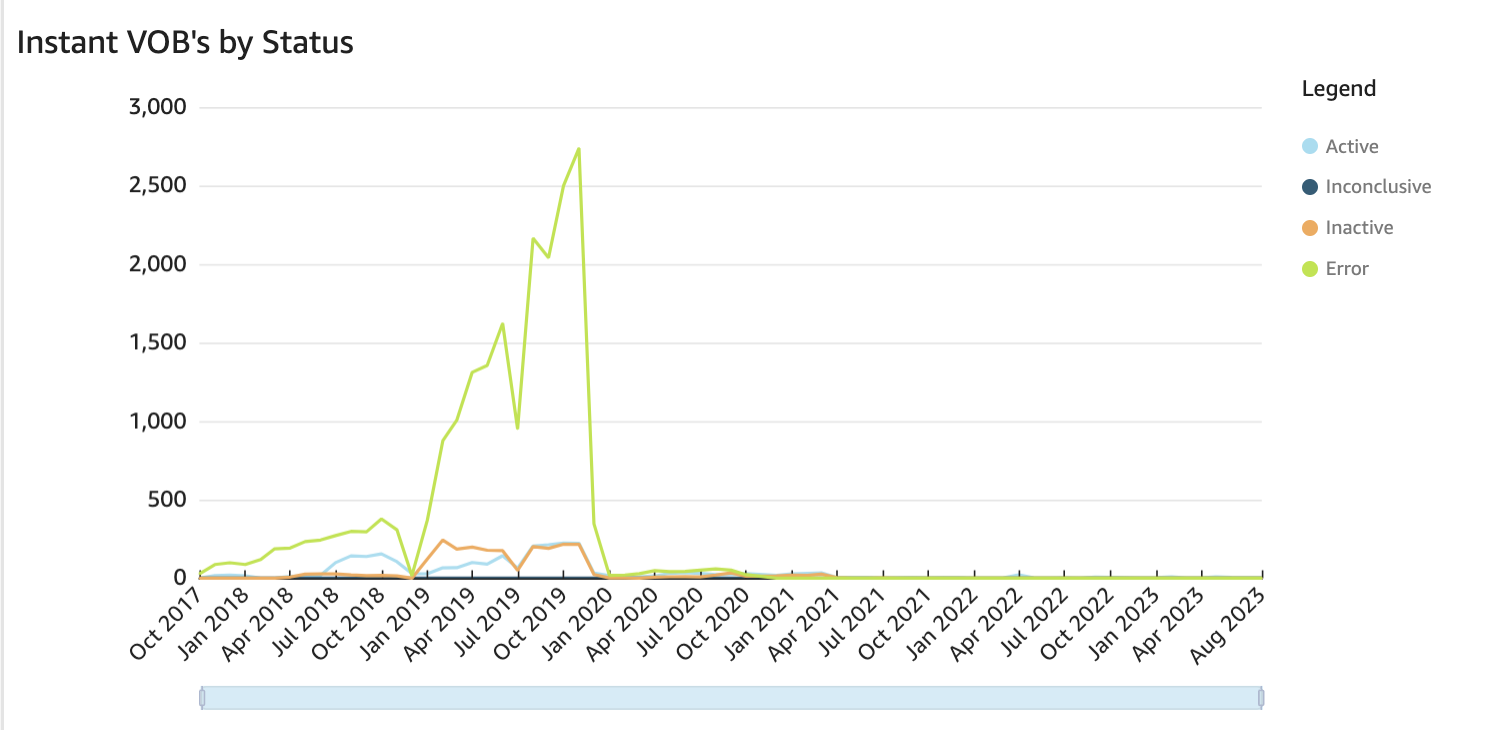 Instant VOBs by Status: Visualization of the total number of instant VOBs requested broken down by status in line graph format.
