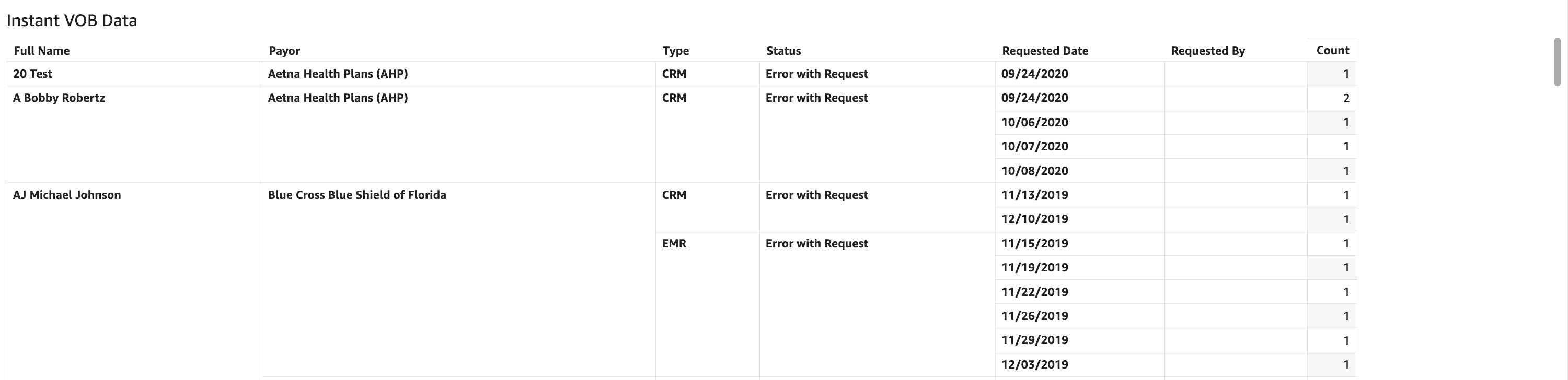 Instant VOB Data: This widget provides a detailed view of each specific Instant VOB request made in the system, presenting them as individual line items.