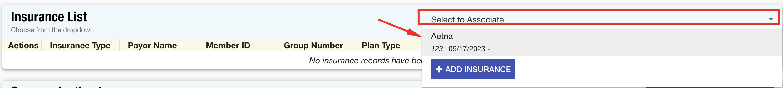- In the Insurance List section, click on the Select to Associate drop-down and add the insurance record you wish to add to the opportunity.