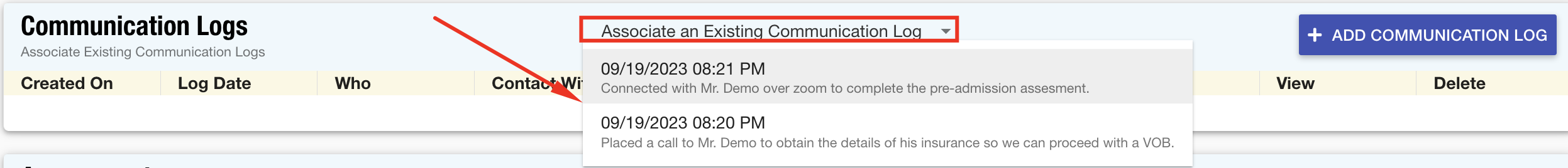 - Moving on to the Communication Logs section, click the Associate an Existing Communication Log drop-down and select any logs you wish to add.