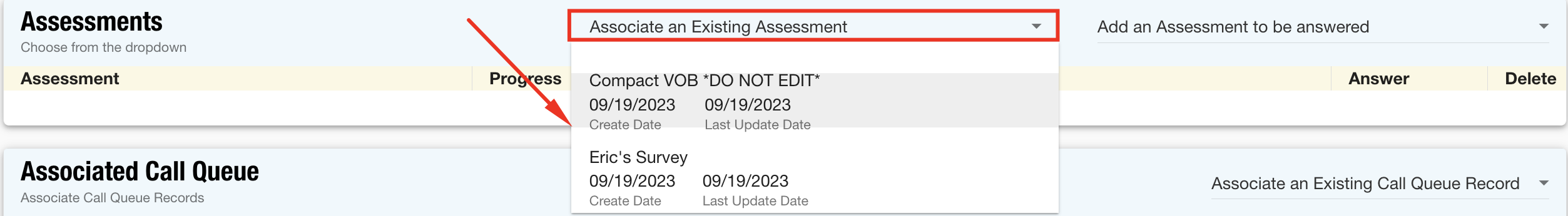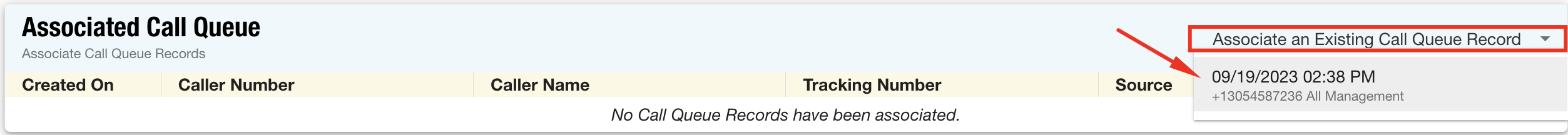 - Finally, click Associate an Existing Call Queue Record in the associated queue section and choose any relevant call records.