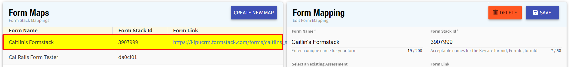 - With the Form Maps list now in view, locate the map in question by Form Stack ID or by Form Name.
