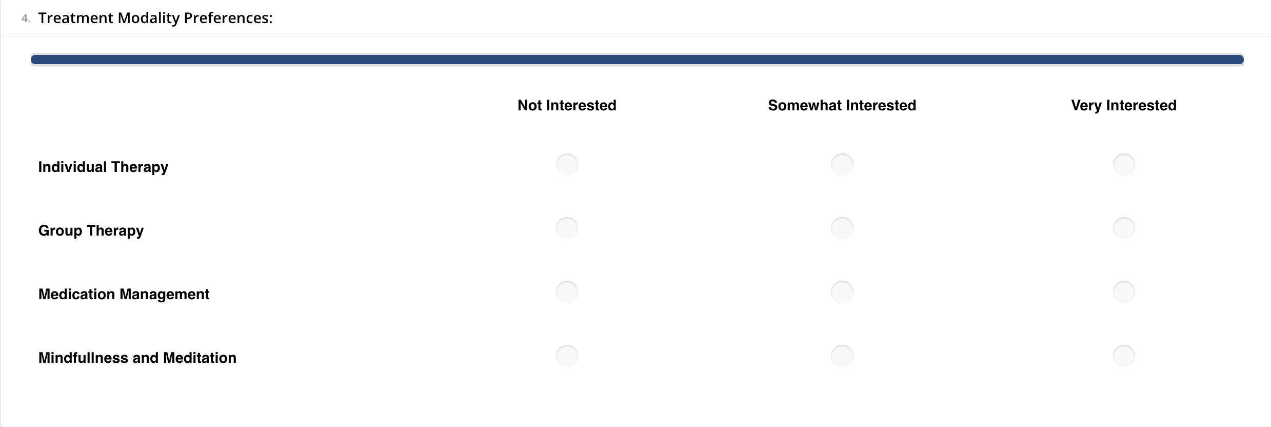 - Single-Select Matrix: A structured input component that allows users to make a single choice from a set of options organized in rows and columns. It is commonly used when there's a need to gather specific data or preferences by presenting a grid-like format for selection, typically used for rating scales or evaluating multiple criteria.