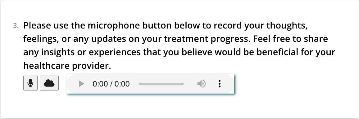 - Microphone: A designated input component in a digital application or form that enables users to record audio. It is commonly used to capture spoken information or verbal responses, facilitating the integration of audio data within digital processes or applications.