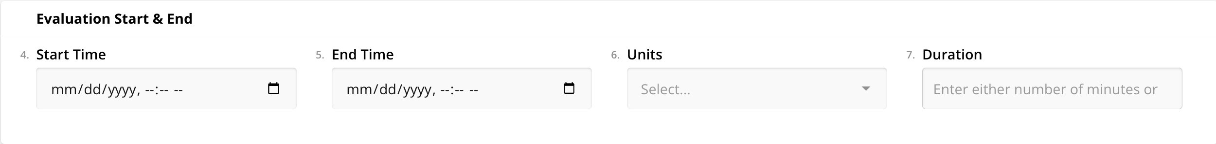 Evaluation Start & End: A structured component within a system or document used to input and specify the beginning and conclusion dates or timeframes for an evaluation process or assessment. It is commonly employed in various contexts to define the period during which evaluations or assessments are conducted or measured accurately.