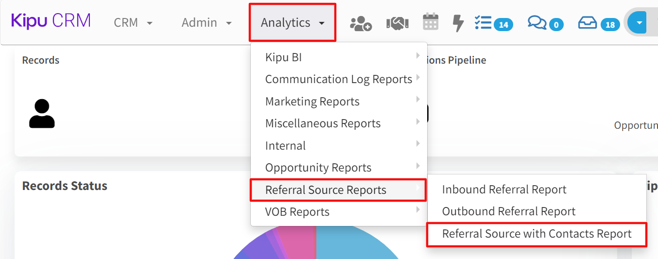 - Select the Analytics tab drop-down menu followed by Referral Source Reports. Afterward, select the Referral Source with Contacts Report.