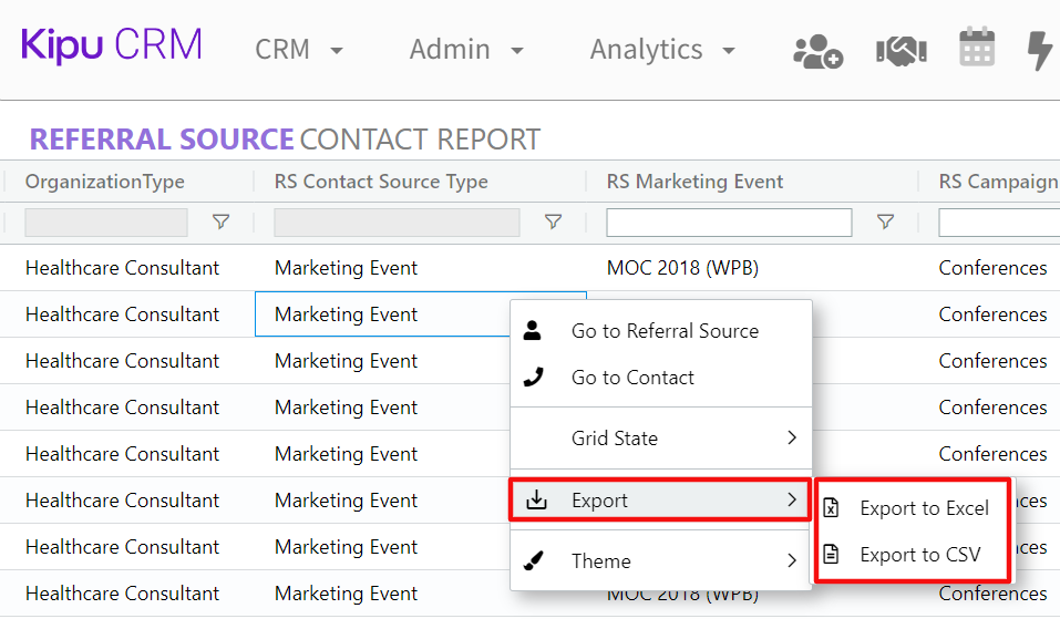 - Once the Referral Source Contact Report is on your screen, right-click any area within the grid to access the pop-up menu. Then choose Export followed by Export to Excel or Export to CSV.