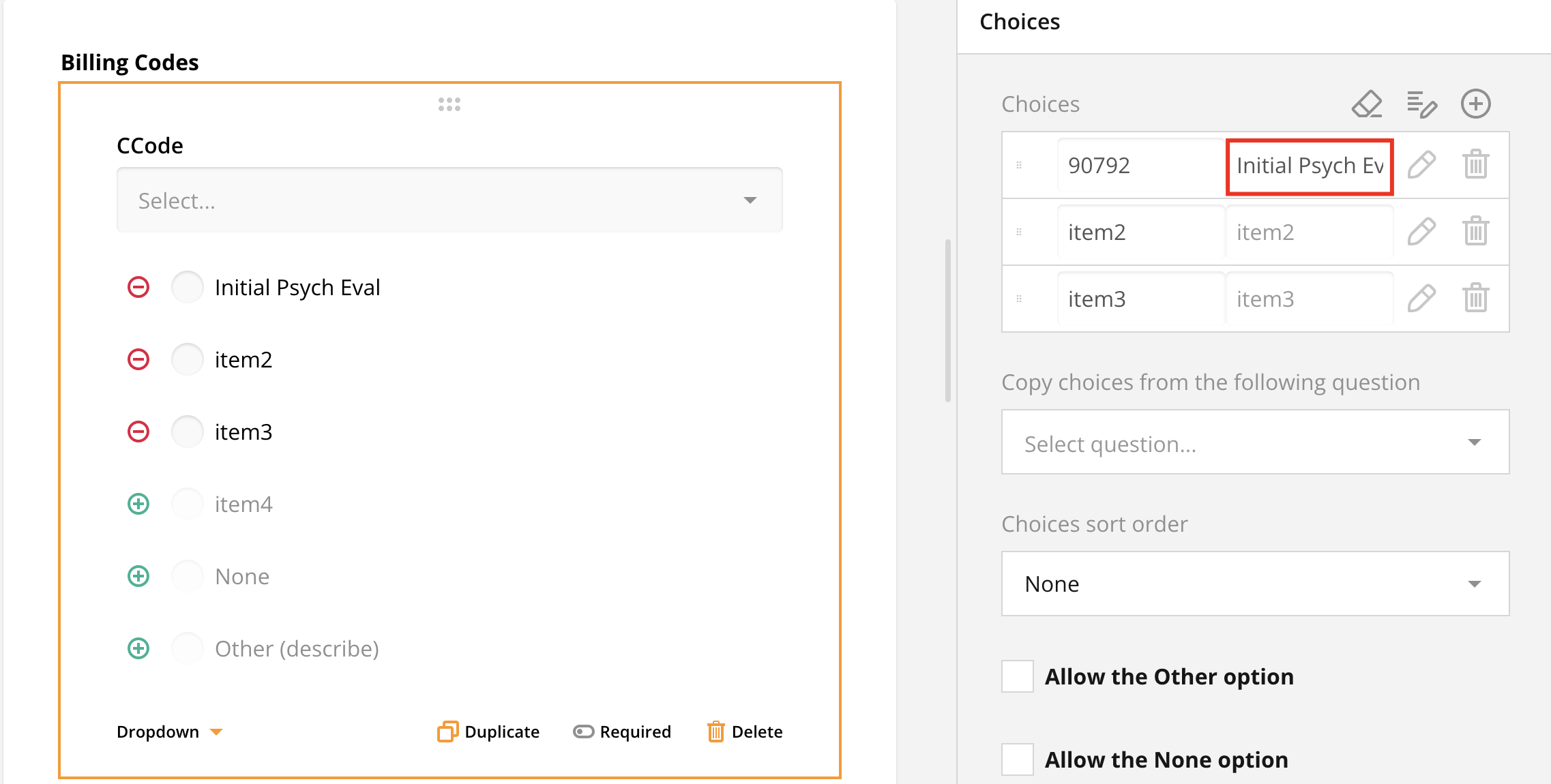 - Once you are ready, map your billing codes to their corresponding field(s), click on the desired code field.