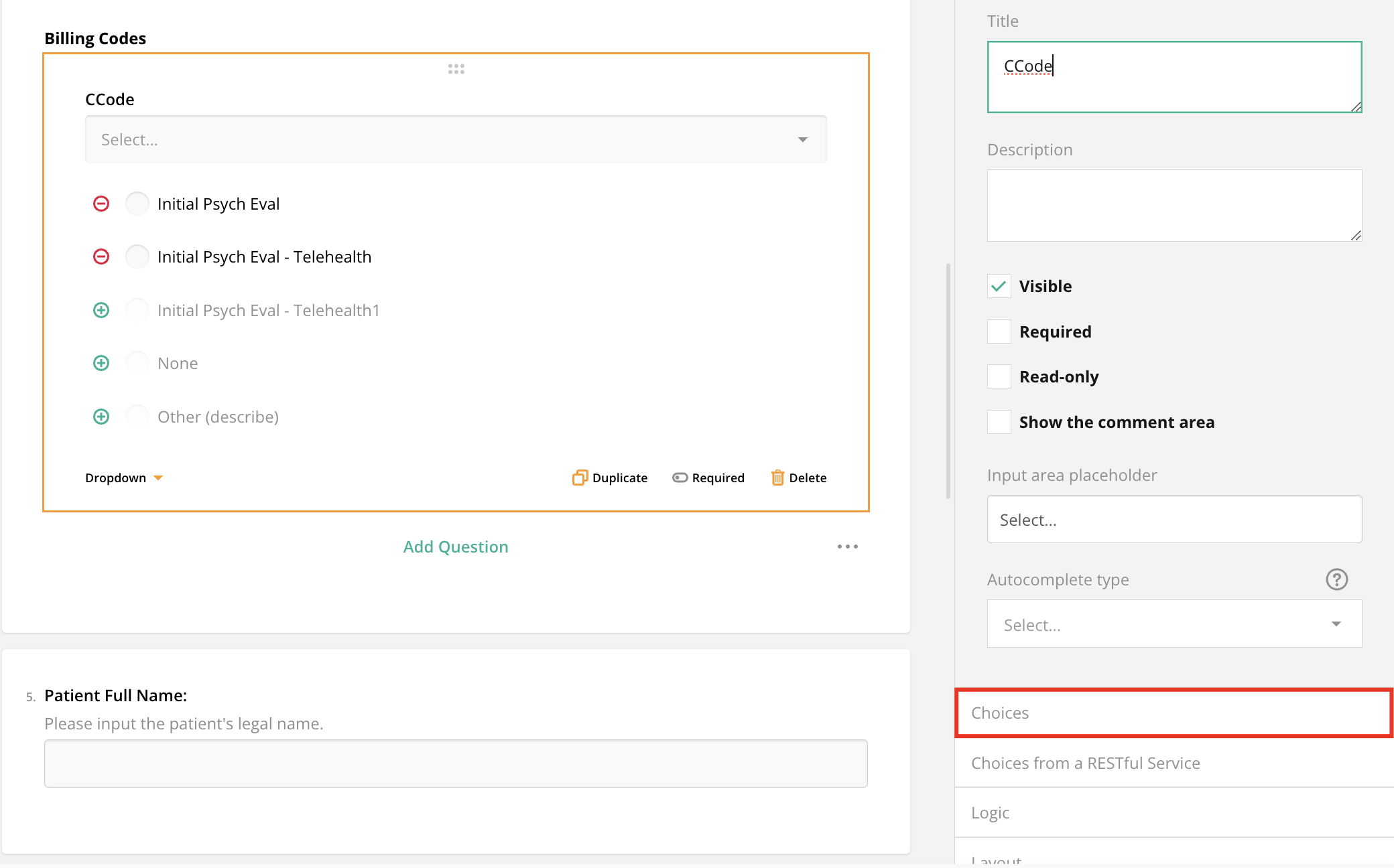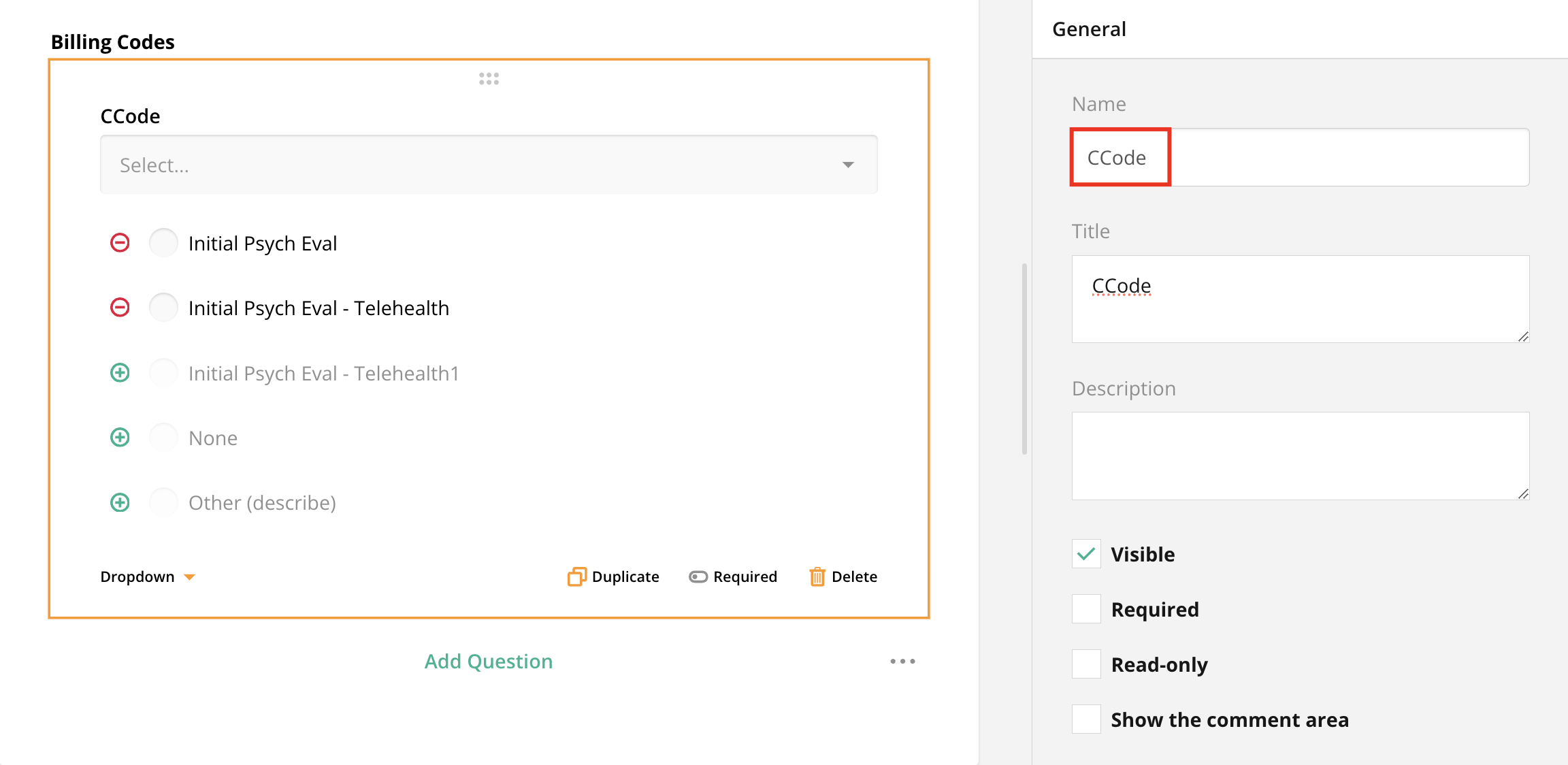 - Select the Billing Codes option to add Rcode, Ccode, Hcode, and Custom Code fields.