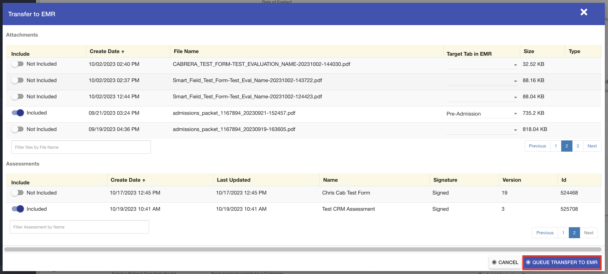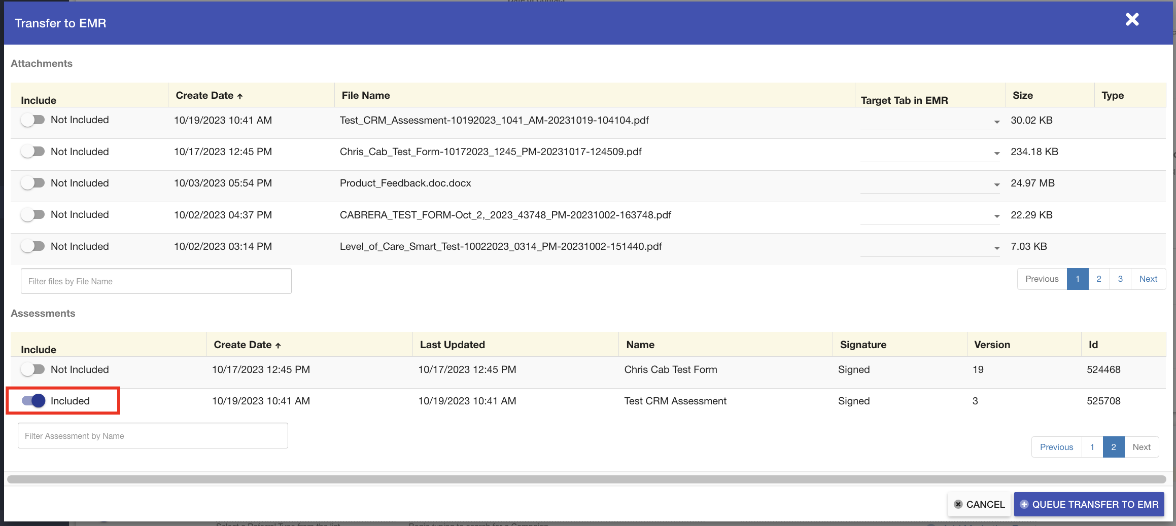 - Once you have marked all desired attachments and live form assessments for transfer, click on Queue Transfer to EMR.