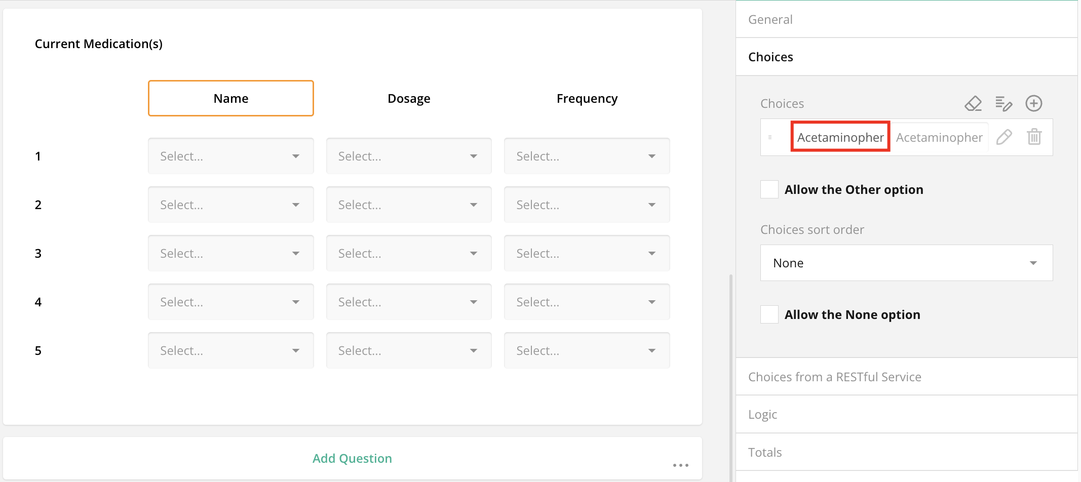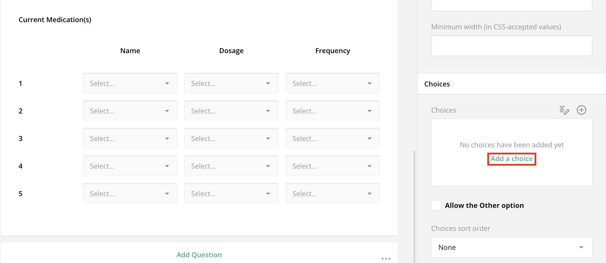 - In the Choices section, use the top left field to create your first choice option. We will refer to this field as the value field.