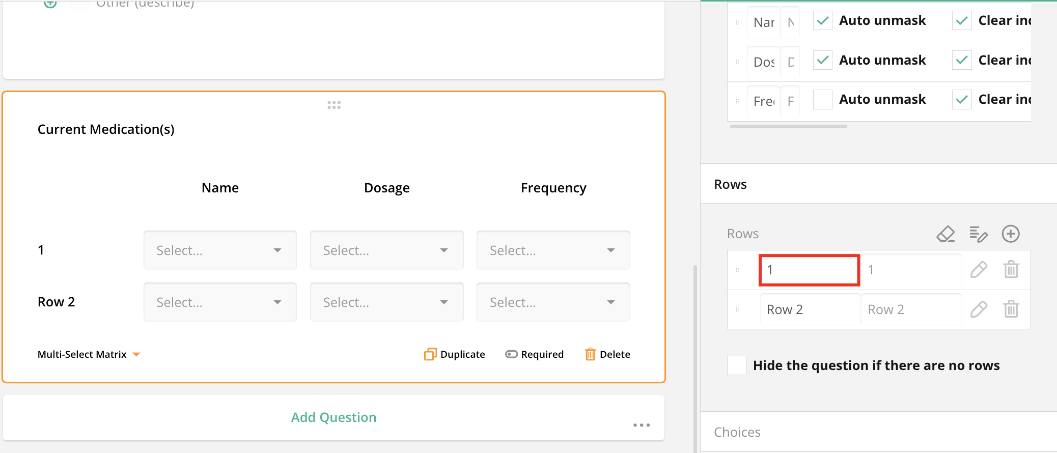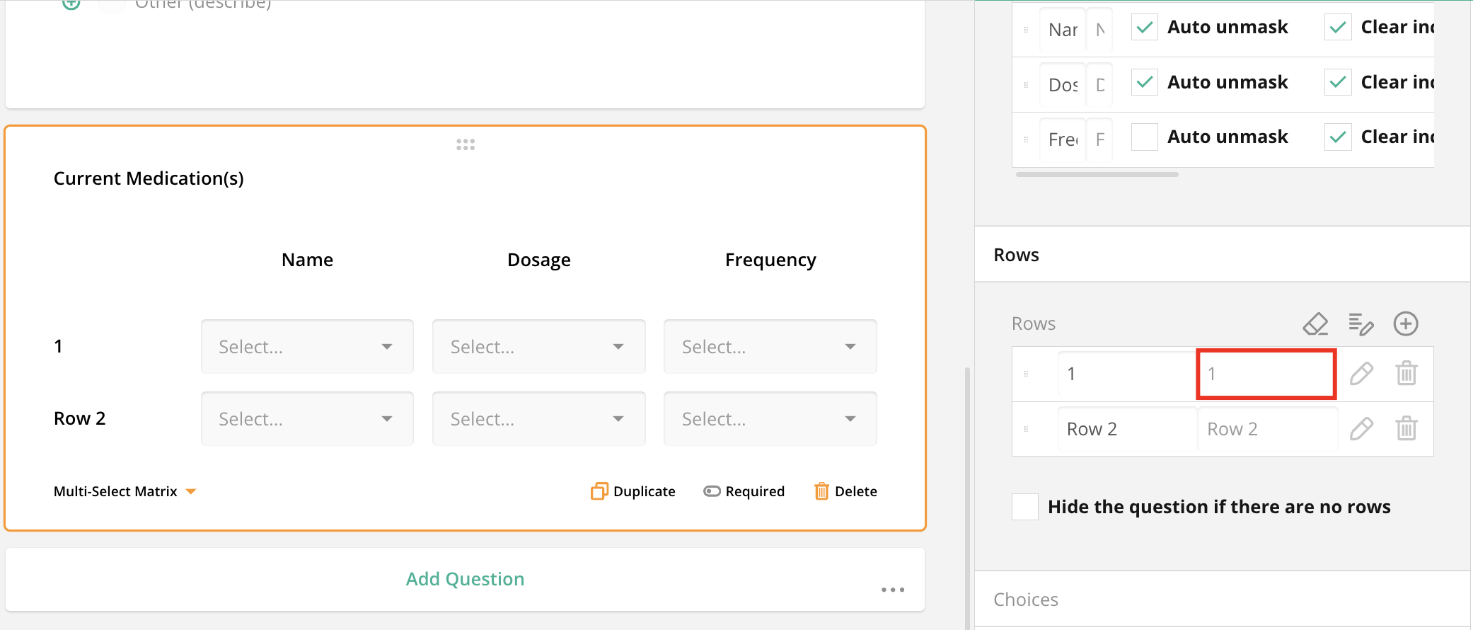 For Dropdown fields within a matrix, the value & text fields must match in order for it to populate correctly in the Kipu EMR. Please the image below.