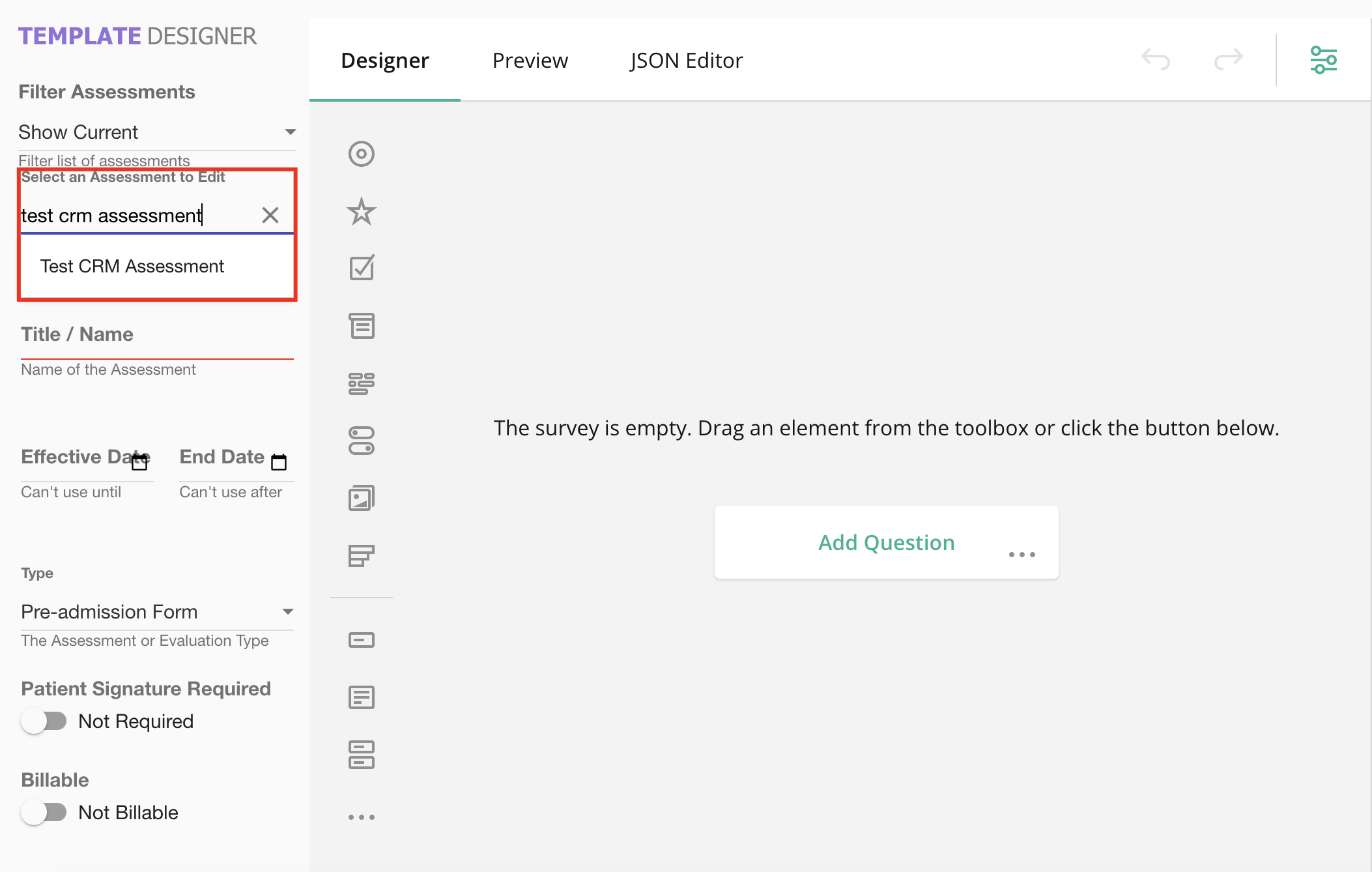 - Use the Select an Assessment to Edit field, to search for and select your desired form template.
