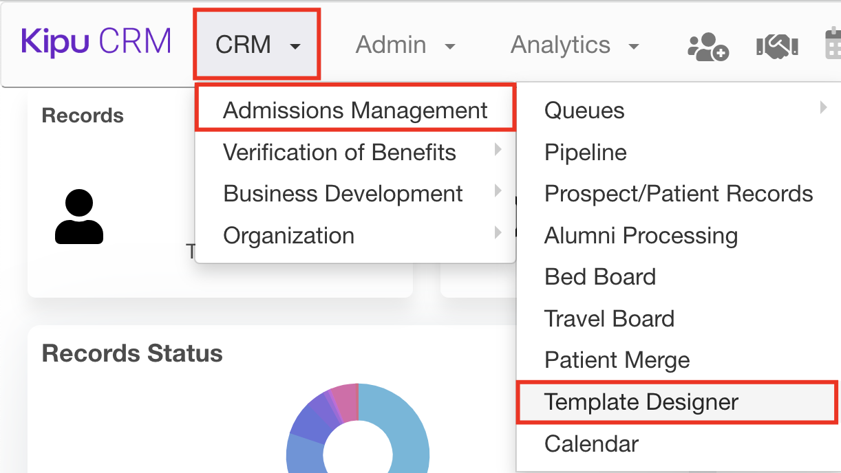 - Navigate to CRM > Admissions Management > Template Designer.