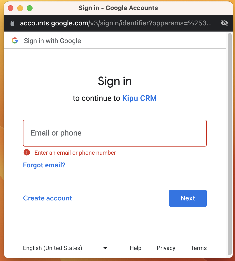 - Note: The Gmail account selected must be the same email you use to login to the Kipu CRM.