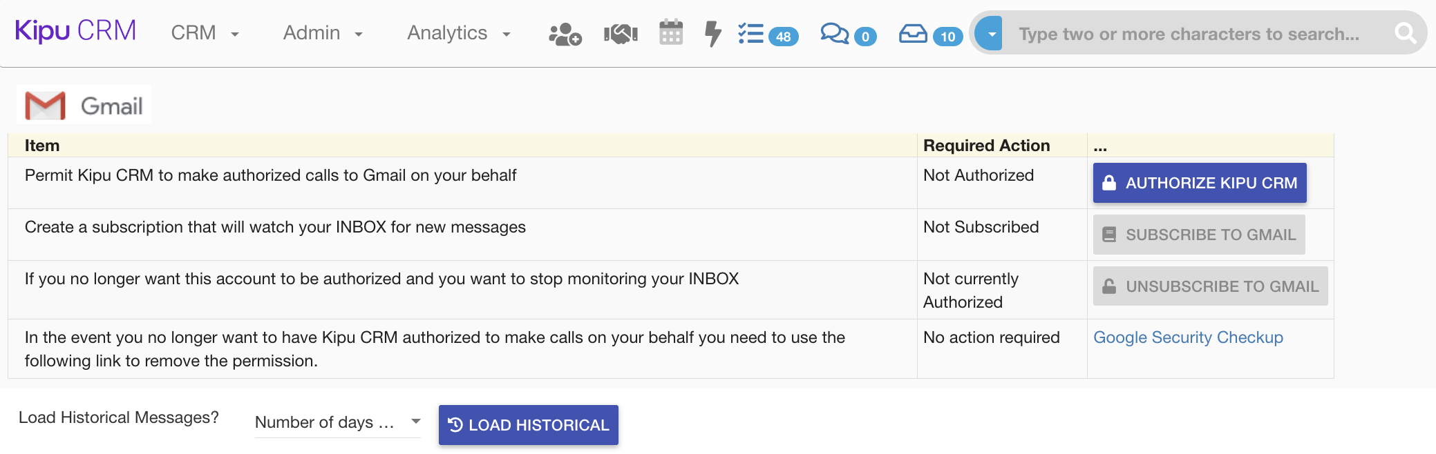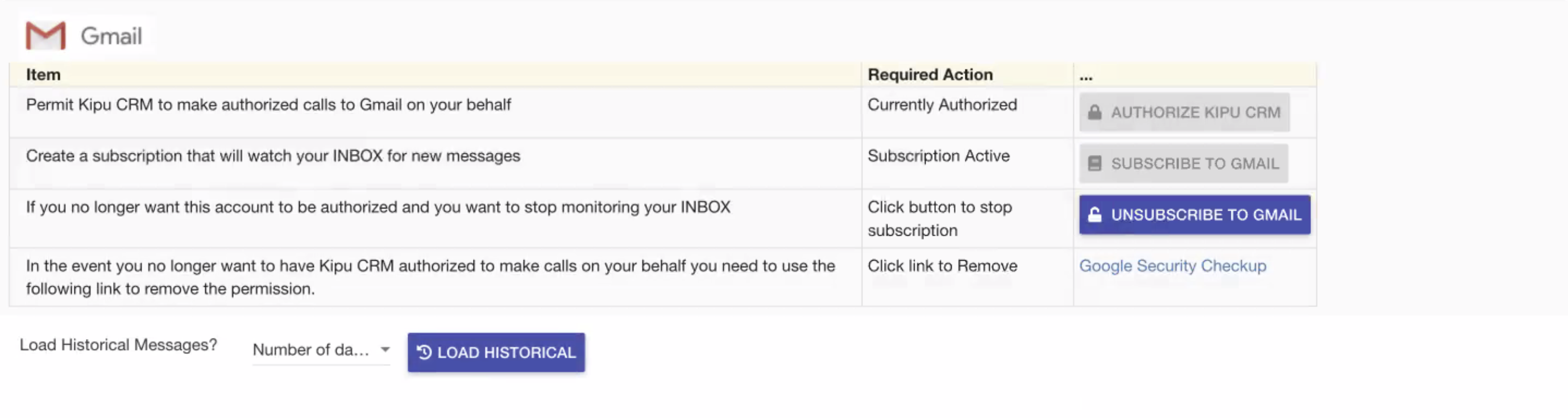 - Return to https://www.kipucrm.com/#!/main/gmail and select Subscribe to Gmail.