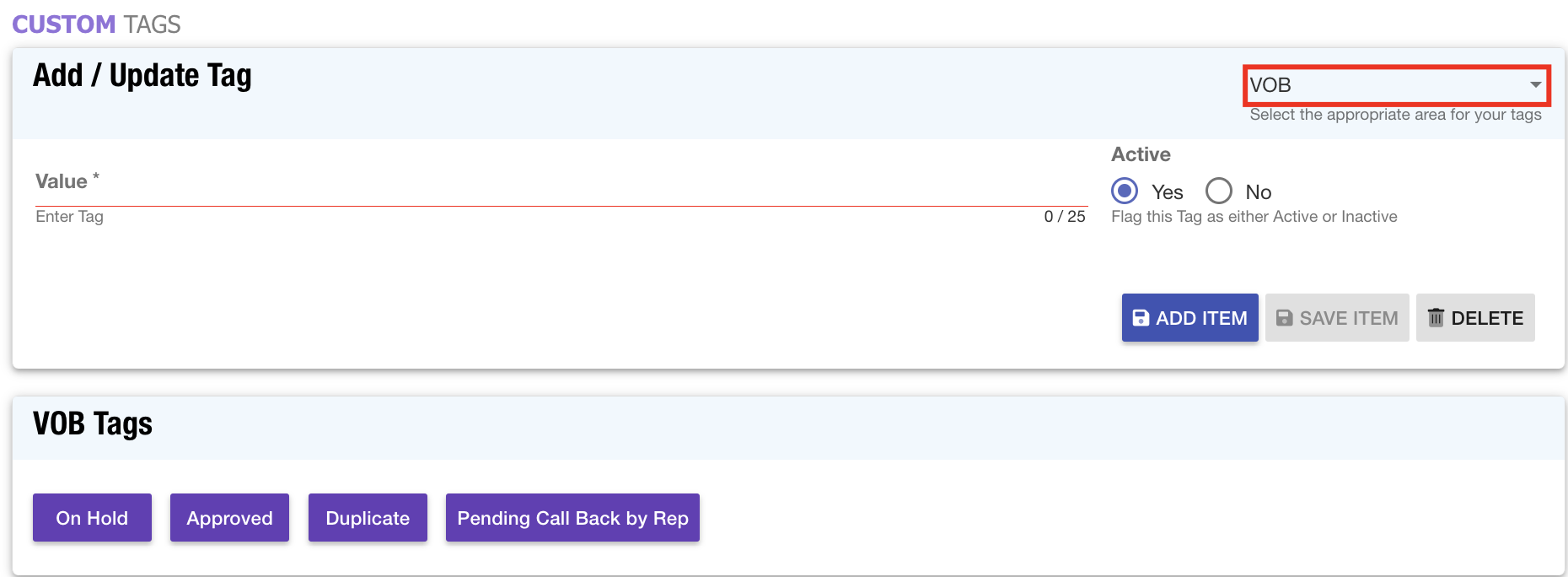 - Tag System: The Custom Tags feature has been enhanced to allow users to create tags for the VOB 2.0 application.