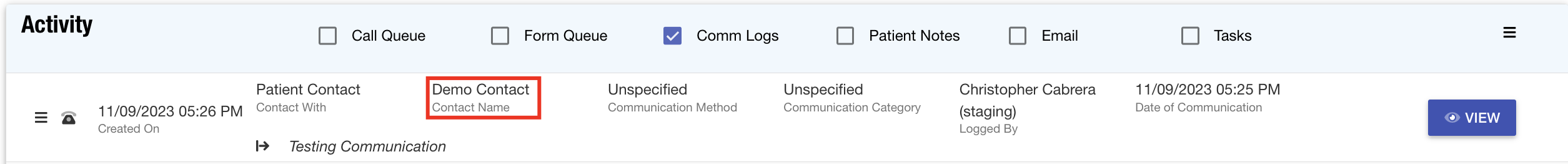 - Patient Activity Panel: The patient activity panel has been updated to showcase contact name tied to communication log records.