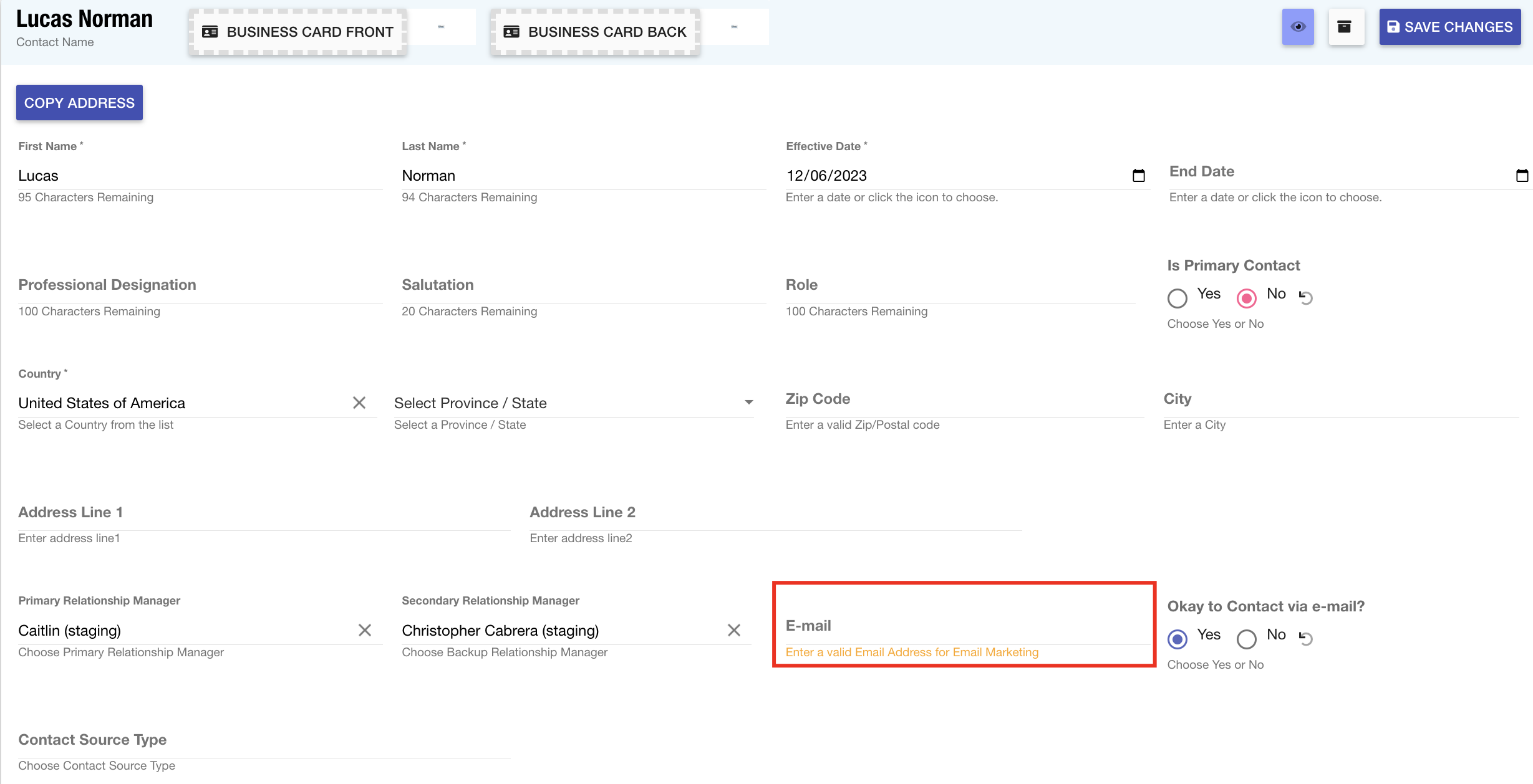 - Referral Source Contacts: The email toggle on RS contact records has been upgraded to provide a warning. This alert prompts users to input a valid email address when the contact opts in for email marketing, ensuring accurate and effective communication.