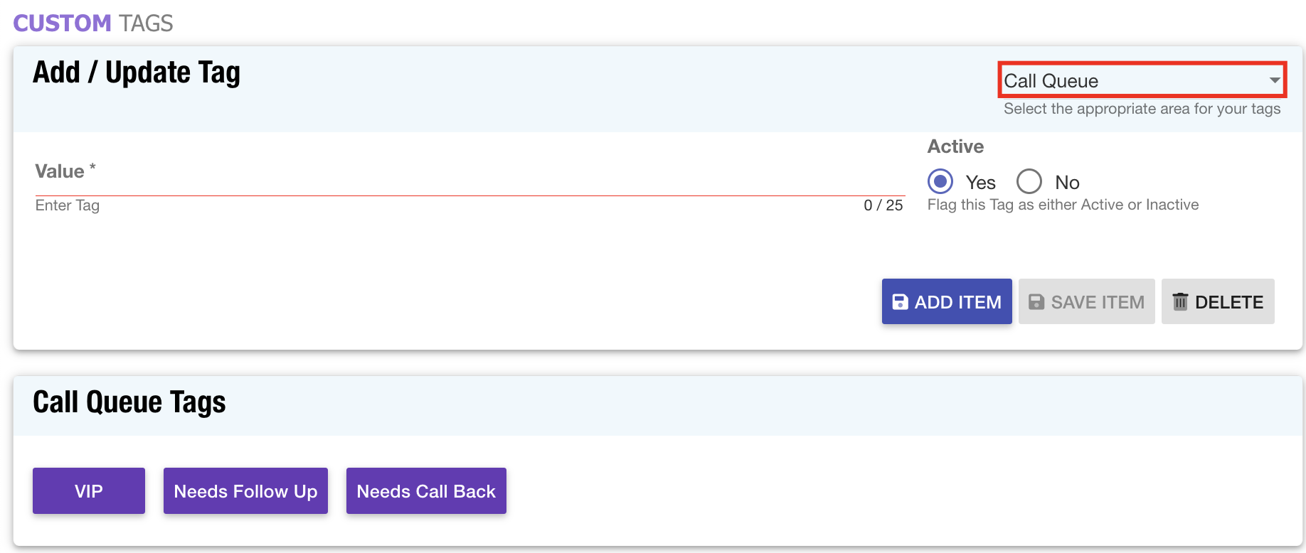 Custom Tags: The custom tags feature has been updated to grant users the capability to create tags for Call Queue records.