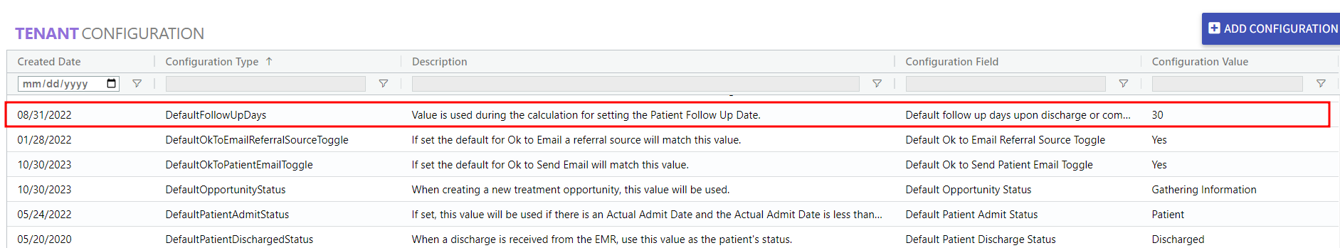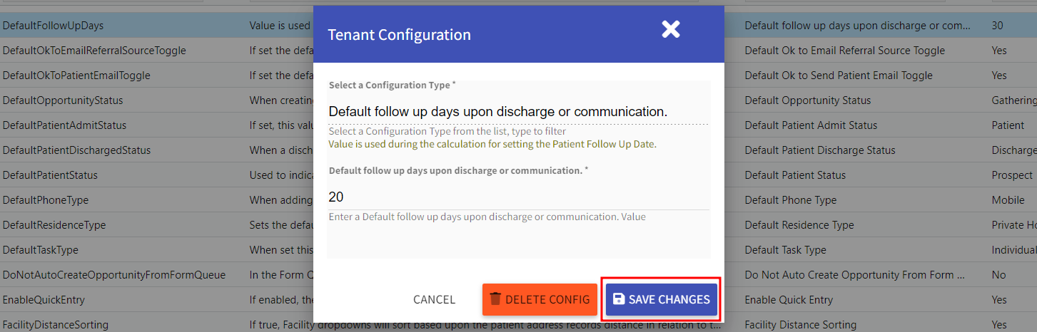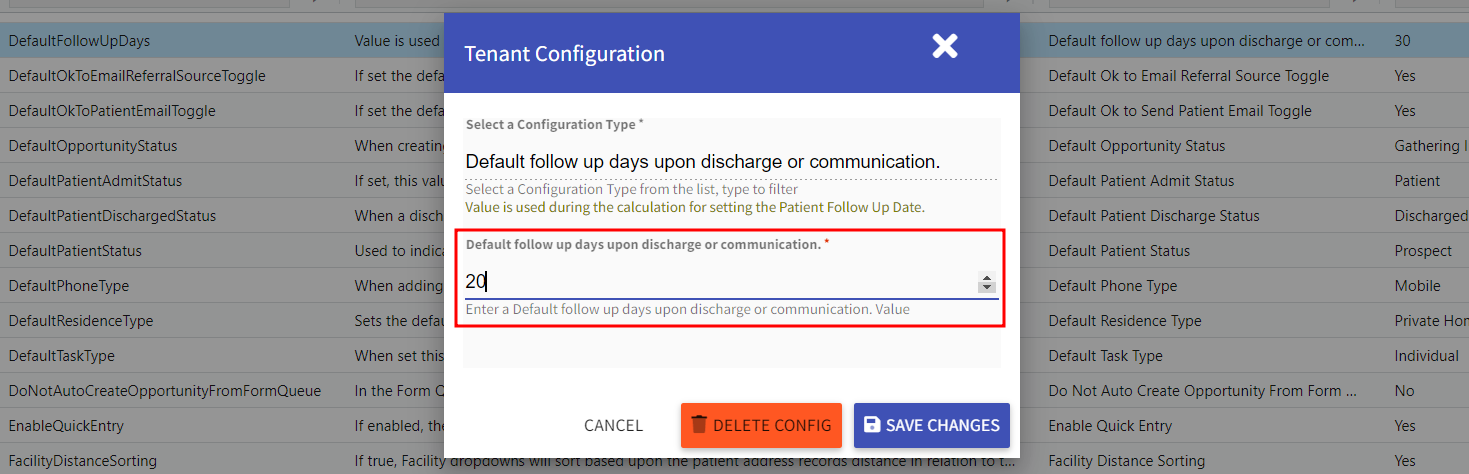 - Locate and select the DefaultFollowUpDays configuration type.