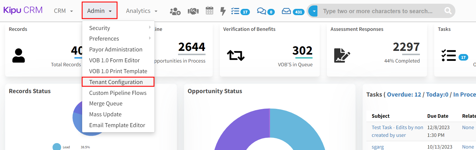 - Click Admin and then Tenant Configuration in the dropdown menu.