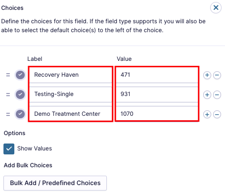 - Enter all facility names in the Label fields and corresponding facility IDs in the Value fields.