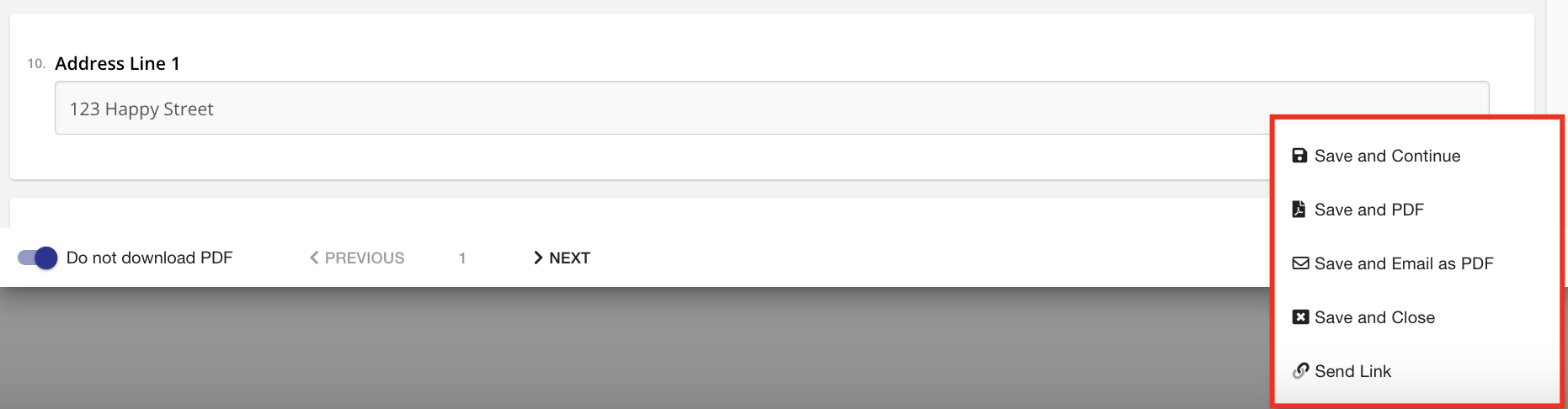 • Save and PDF: Choosing this option closes the assessment response modal and a PDF copy of the completed form will become available in the Manage Files application.