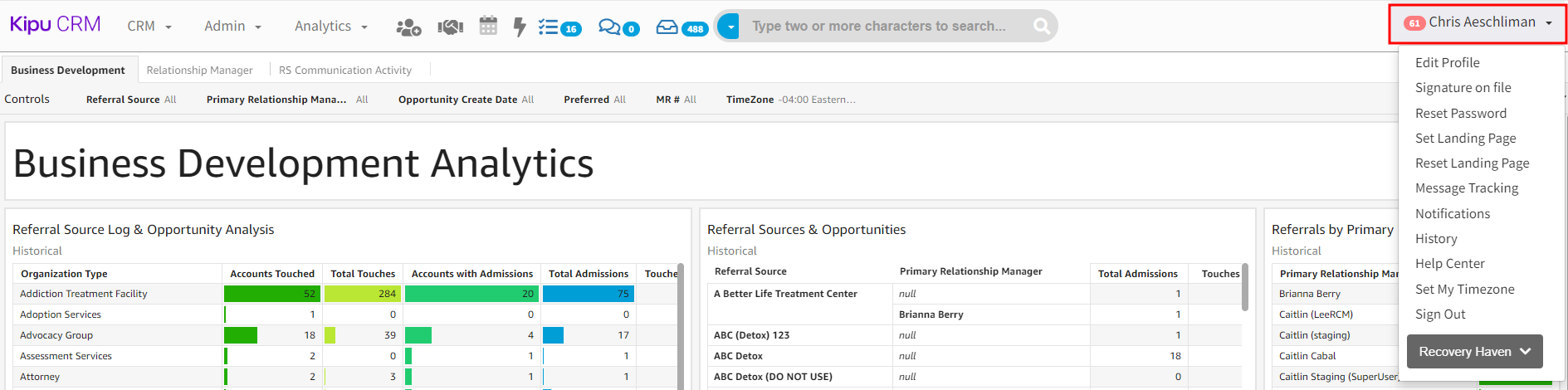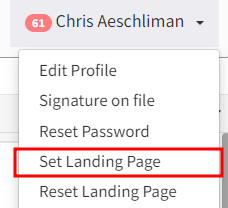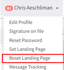 - To reset the landing page to the main dashboard please select your display name again, instead selecting Reset Landing Page.