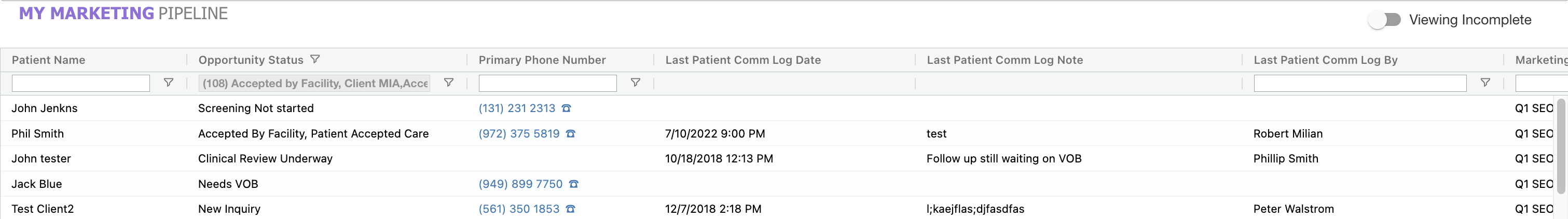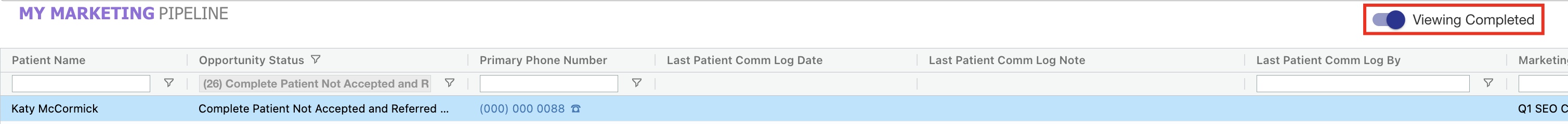 To view closed/completed referrals on the My Marketing Pipeline grid, set the toggle to Viewing Completed.