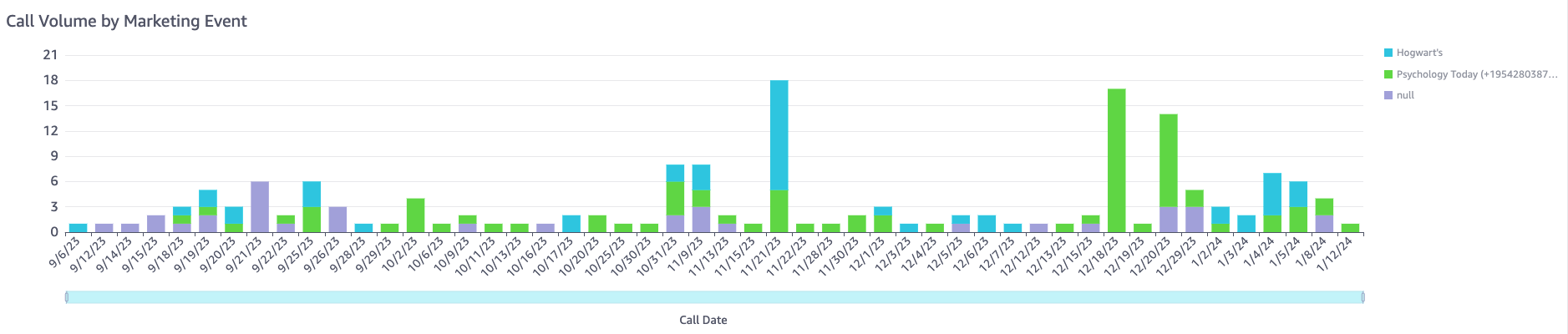 Call Volume by Marketing Event: This widget contains color-coded daily call volume stats displayed by event date.