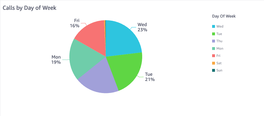 - Calls by Day of Week: This pie chart displays call volume statistics broken down by day of the week.