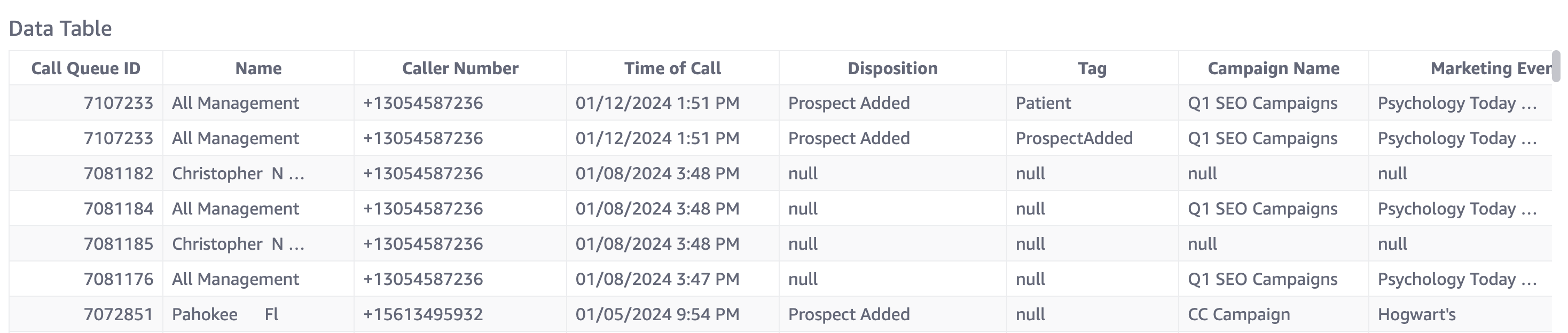 - Data Table: This data table shows the all call record information that can be found in the Call Queue widgets.