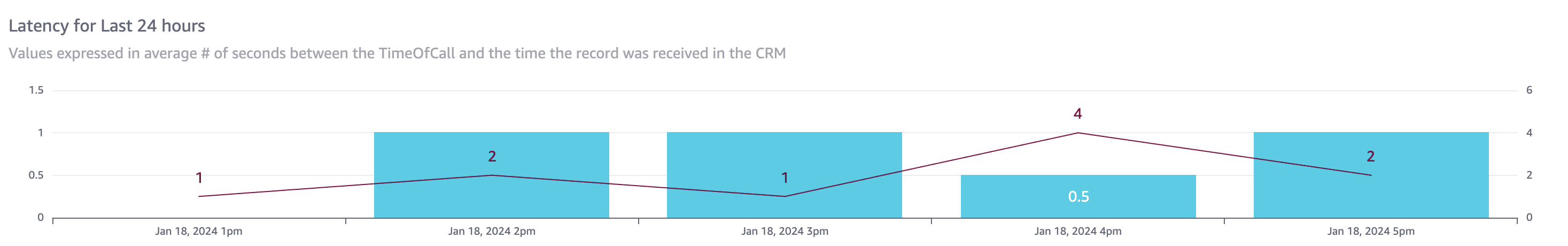 - Latency for Last 24 hours: This widget indicates how many seconds passed between the call and the reception of the record in the CRM for calls that occurred in the last 24 hours.