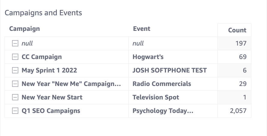 Campaigns and Events: This widget lists the total number of inbound calls received from each campaign and marketing event recorded in your CRM.