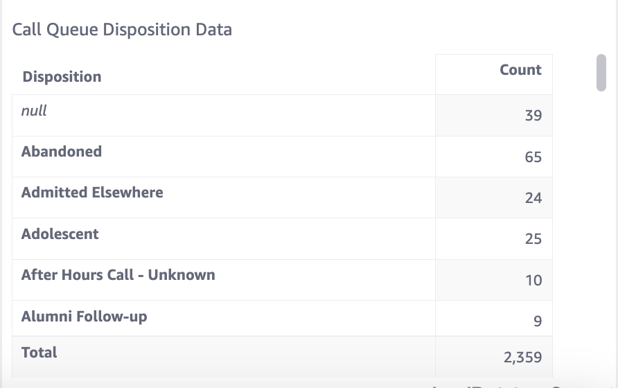 Call Queue Disposition Data: This widget displays the total count of inbound call records listed by disposition.