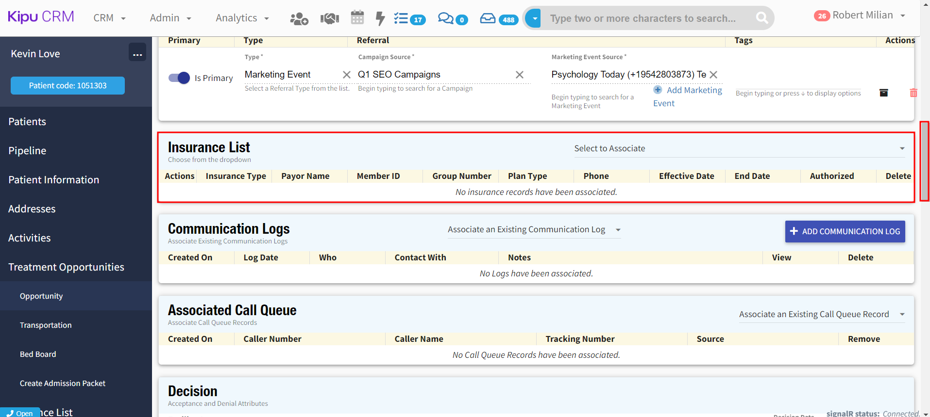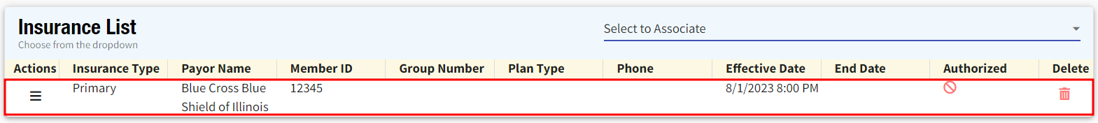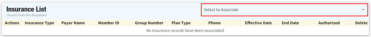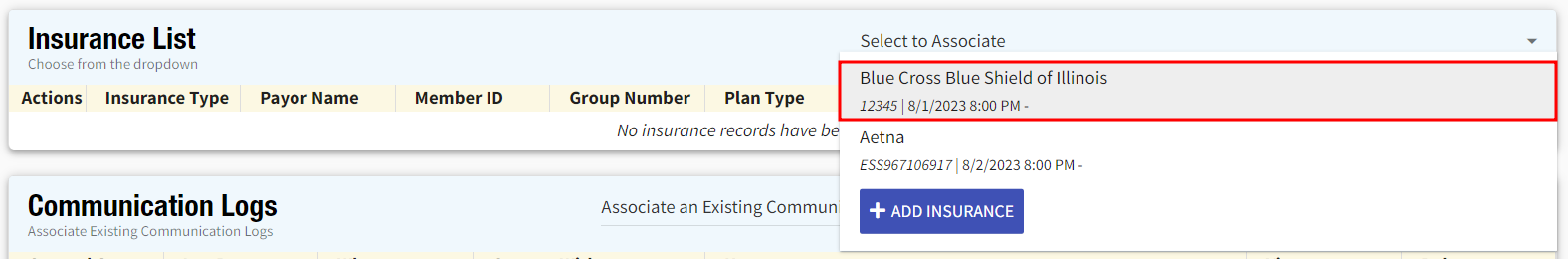 Once a Treatment Opportunity has been created, any insurance records on file tied to the Patient record can be associated with that opportunity using the Insurance List section's Select to Associate field.