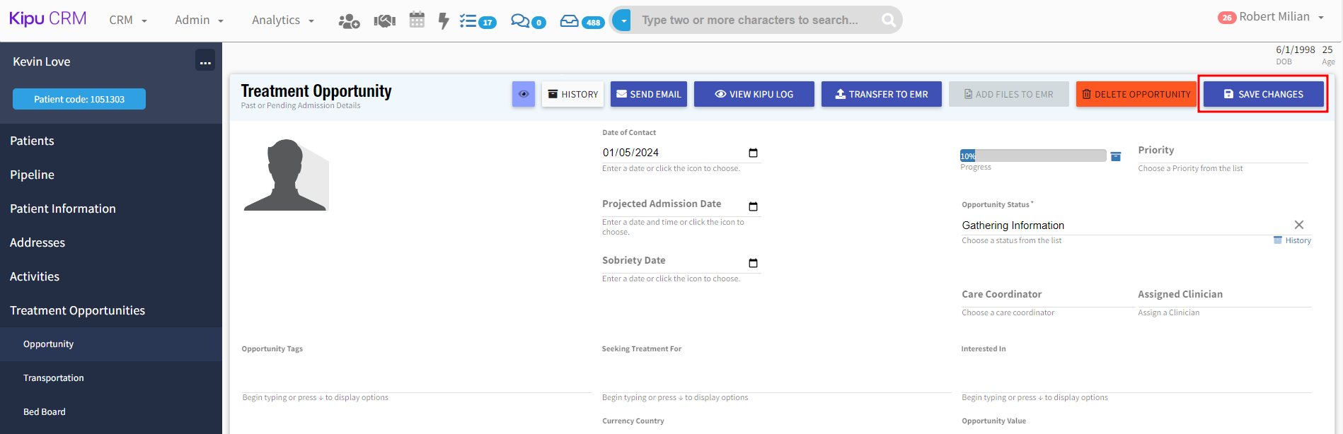 - With the Patient Record open, Navigate to the Treatment Opportunities section by selecting Treatment Opportunities on the navigation panel on the left-hand side of your screen and selecting the appropriate Treatment Opportunity.